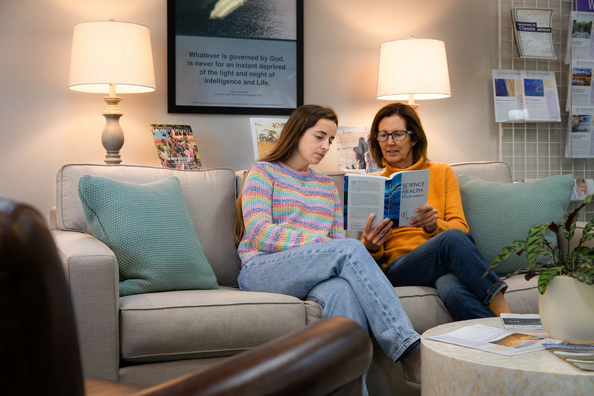 Our Sunday services are a time of inspiration, prayer, and hymn singing. Two members read a sermon consisting of selections from the Bible and the Christian Science textbook, Science and Health with Key to the Scriptures by Mary Baker Eddy. These two books were ordained by Mary Baker Eddy as the dual Pastor of the church.